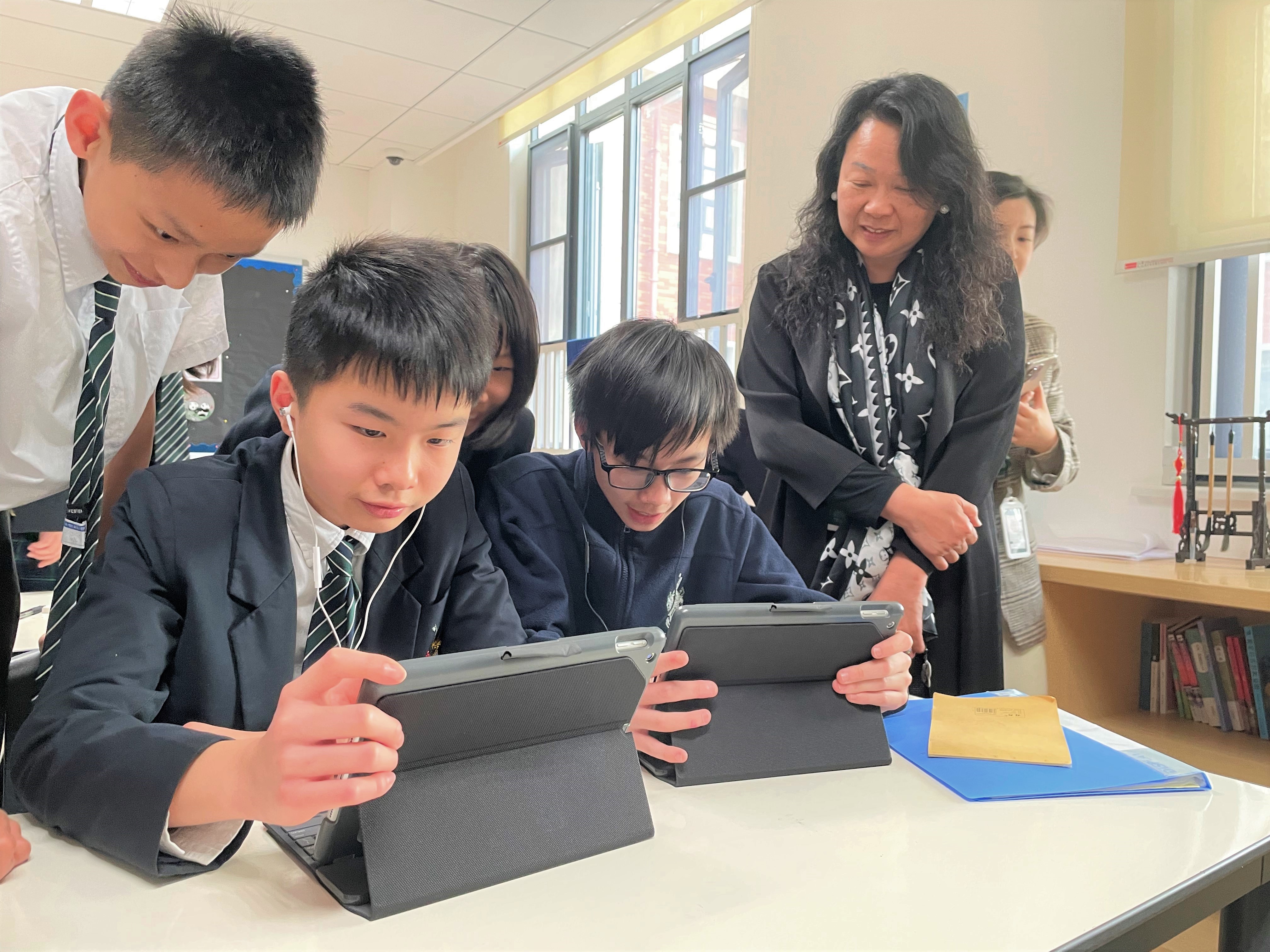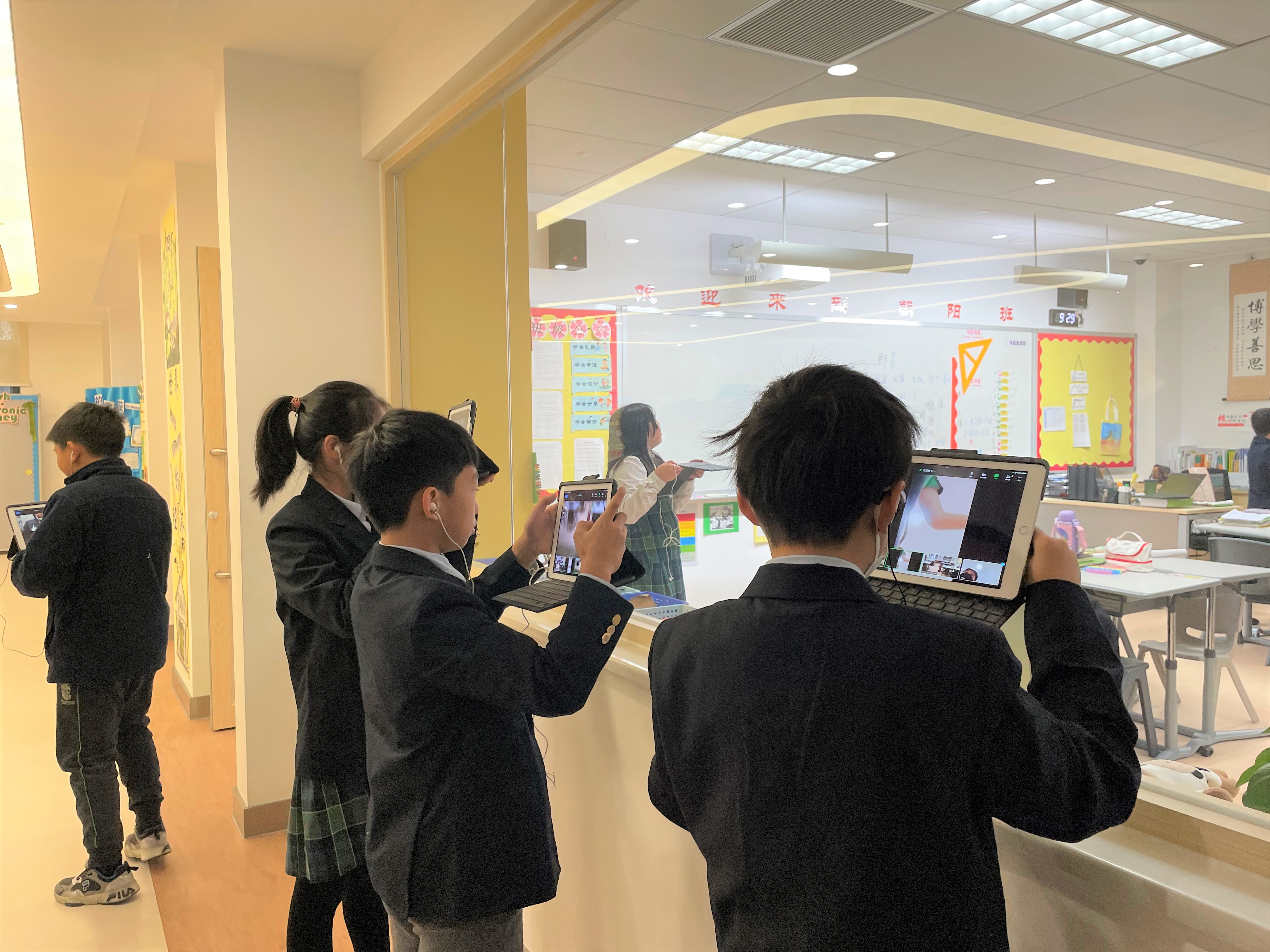 在12月10日当天,待香港墨尔文的施老师和成都墨尔文的代老师将孩子们分组完毕后,成都的学生迫不及待地打开麦克风,用英文与香港的同学们打招呼。彼此尽管没有面对面交流,但丝毫不减孩子们的热情。他们拿着平板电脑在校园里穿梭,希望在有限的时间内,向对方展示各自的美丽校园。