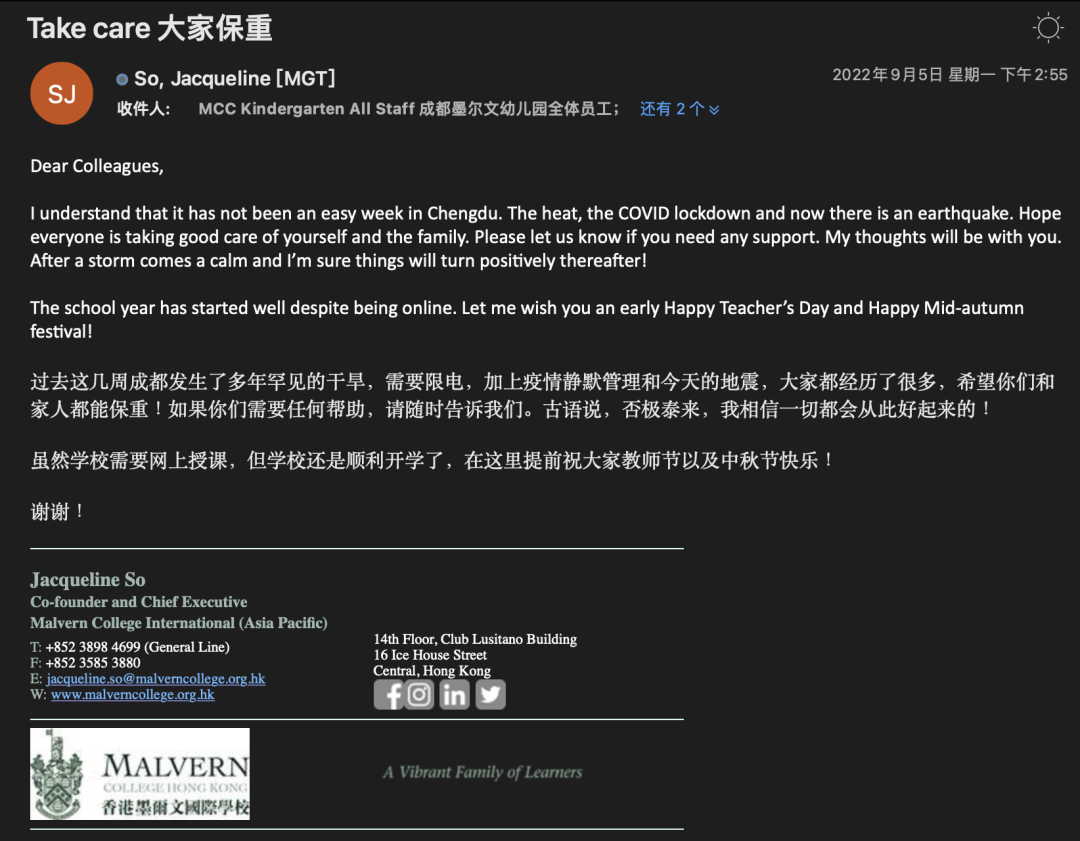 9月5日,四川泸定县发生6.8级地震,成都震感强烈,远在中国香港的墨尔文学校(亚太区)董事长及行政总裁苏婕女士第一时间向我校全体职工发来关心与问候。