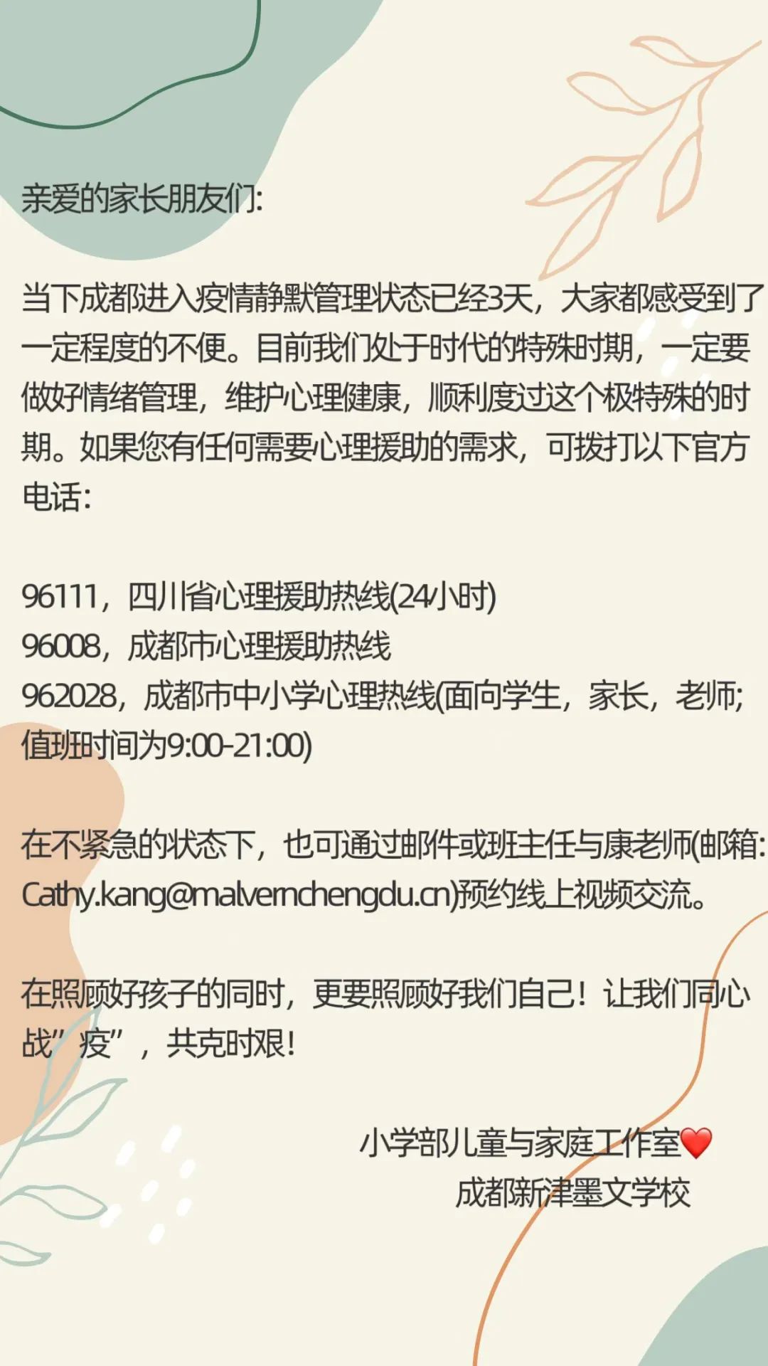 在疫情管控的特殊时期,为了师生与学生、家长的心理健康,我校小学部儿童与家庭工作室第一时间发布公告,为无论是否为本校或非本校的所有人士,免费提供心理援助服务。