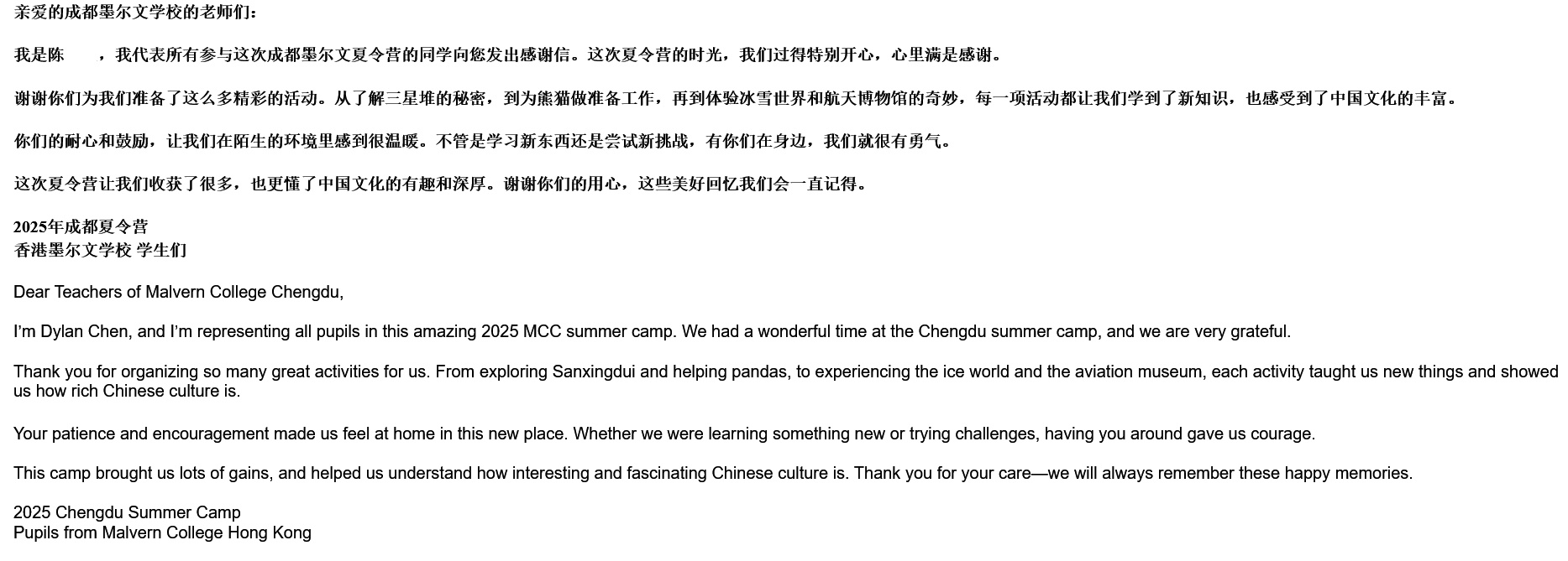 I’m Dylan Chen, and I’m representing all the pupils who took part in this year’s amazing 2025 MCC summer camp. We had a wonderful time at the Chengdu summer camp, and we are very grateful.